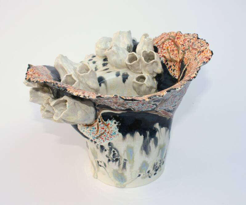 Vaas met zeepokken 2015. Porselein, glazuur en opglazuur. Gestookt op 1240 graden. 17 x 25 cm doorsnede.